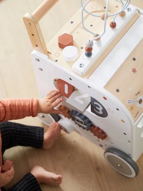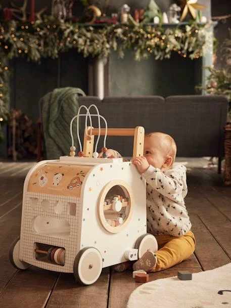Chariot de marche cube d’activités avec freins en bois FSC®.